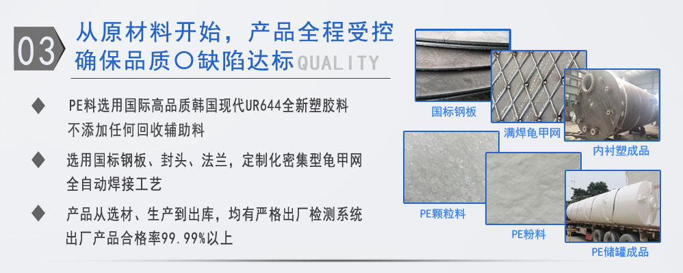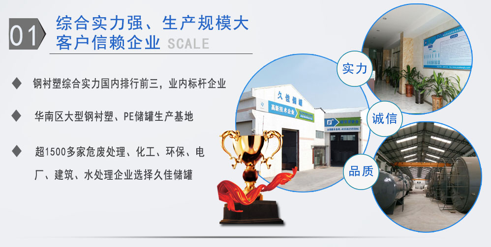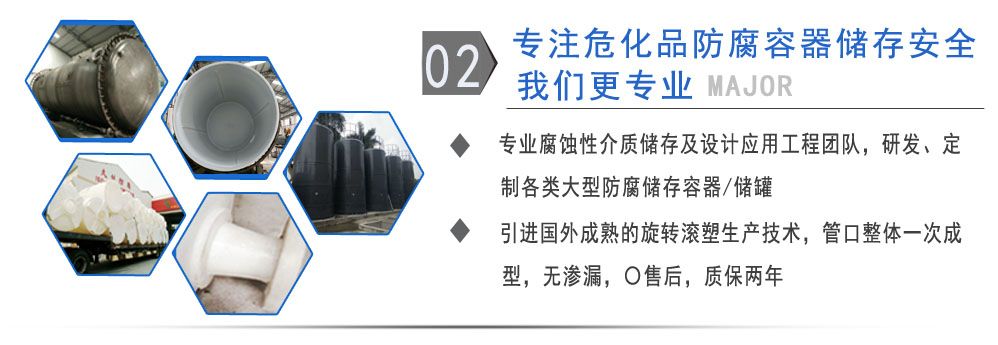 公司有鋼襯塑PE/PO、PE全塑、碳鋼、不銹鋼四大系列100多個(gè)品種,專注于常壓儲存容器生產(chǎn),其產(chǎn)品包括鋼襯塑儲罐管口一體成型PE儲罐碳鋼儲罐不銹鋼儲罐、反應(yīng)釜、攪拌罐、離子交換柱、鋼襯PE/PO儲罐塑料儲罐鹽酸儲罐硫酸儲罐等等。更大限度滿足廣大客戶的各種需求,同時(shí)可以根據(jù)客戶的需要加工定制各種防腐設(shè)備。